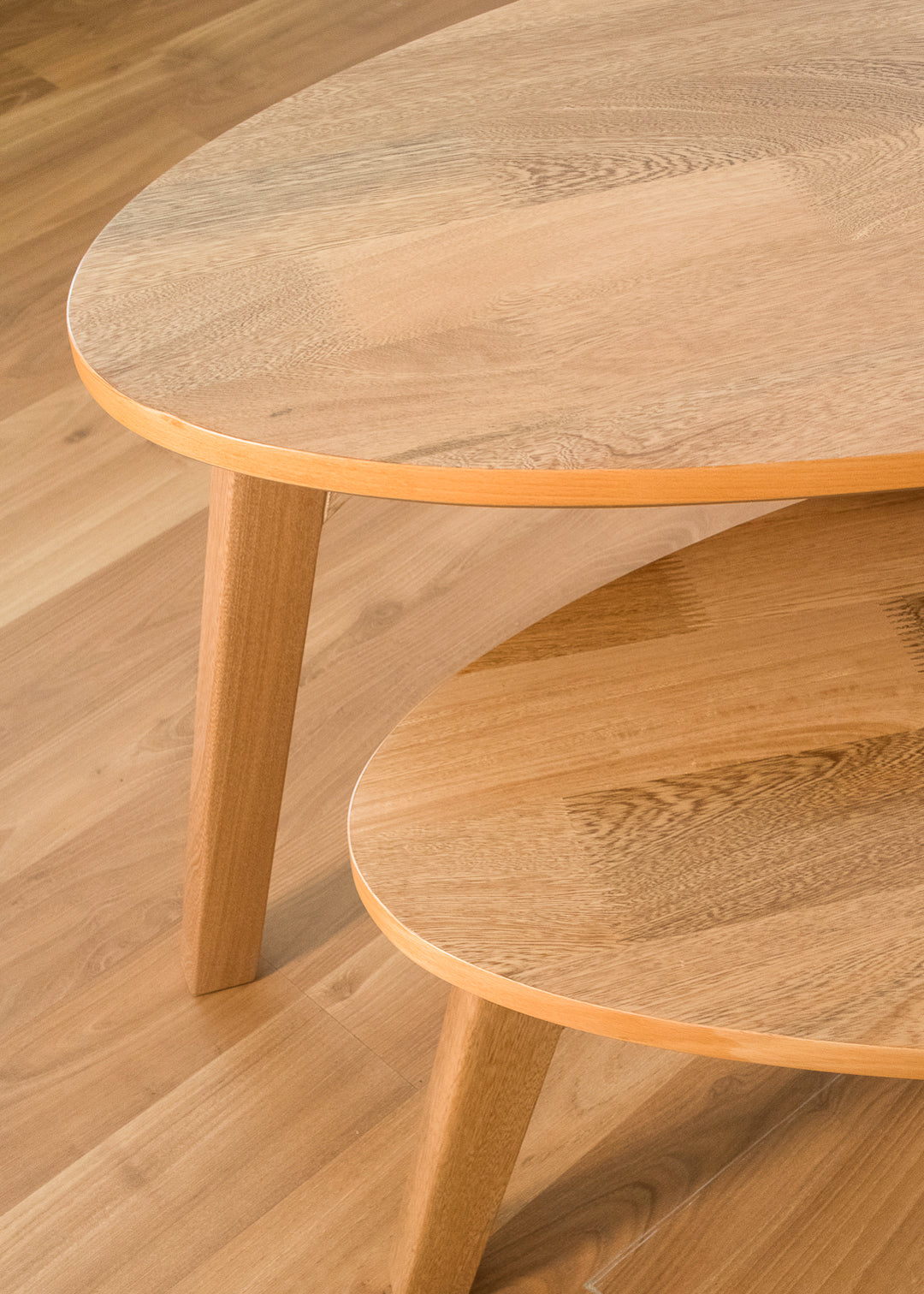 Mesa de centro para interior en madera roble natural, juego de dos mesas con diferentes tamaños. (Este juego de mesas no se vende por separado)