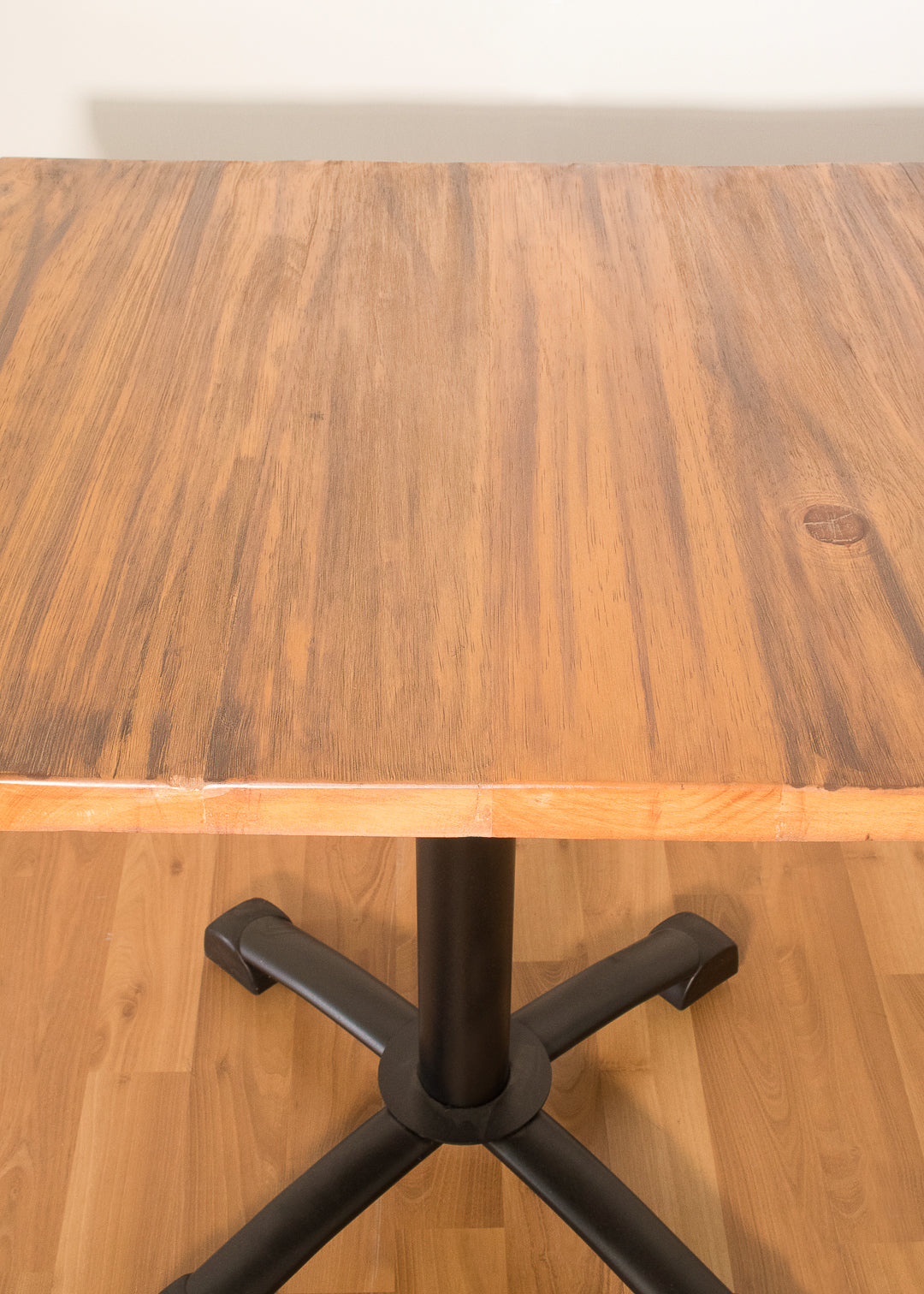 Mesa para interior con superficie en roble grateado y base metálica con pintura electrostática negra, de cuatro puestos.