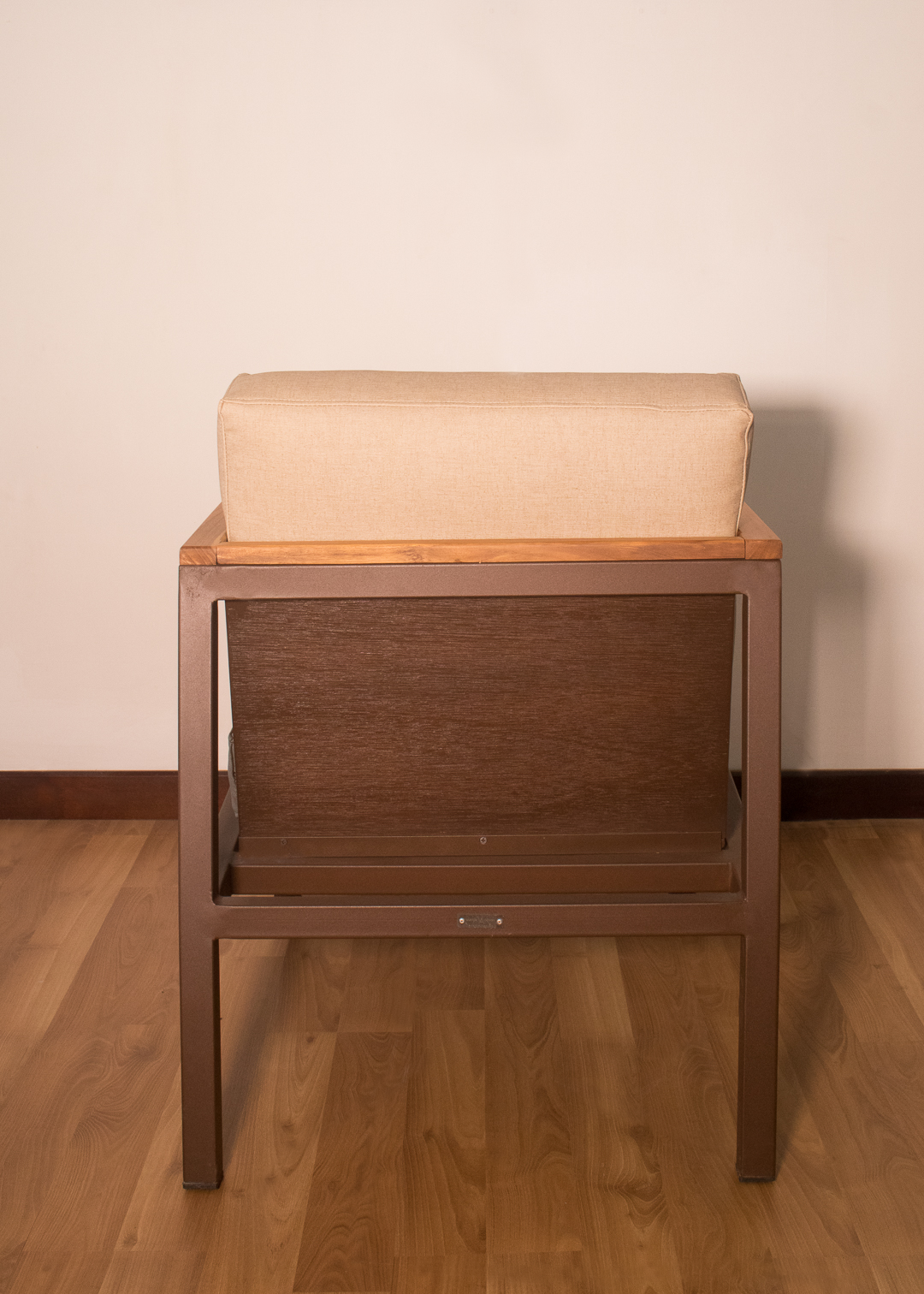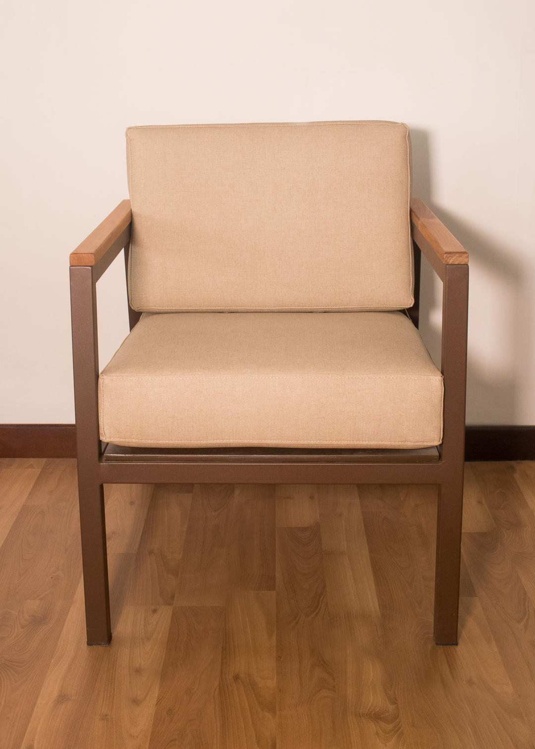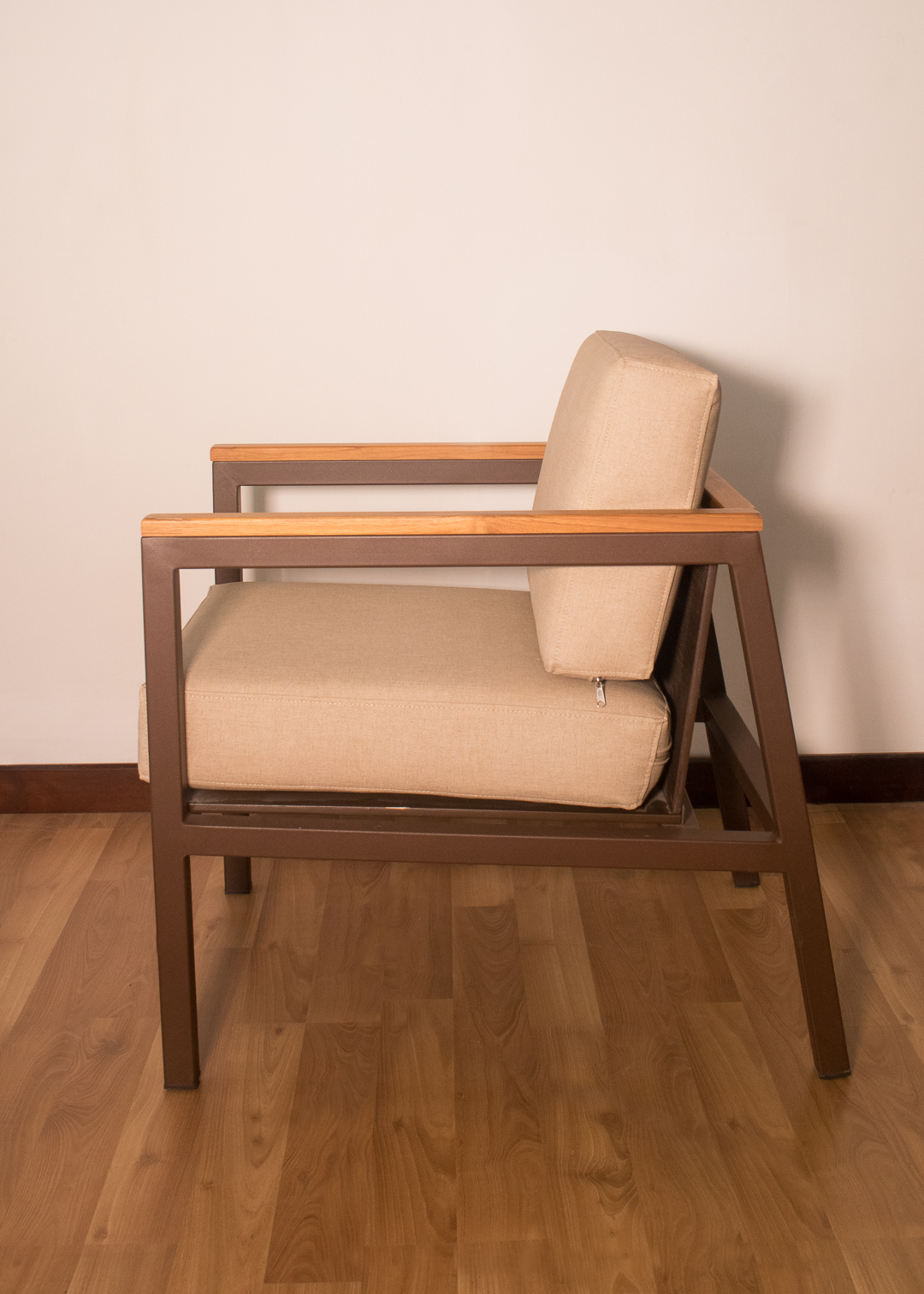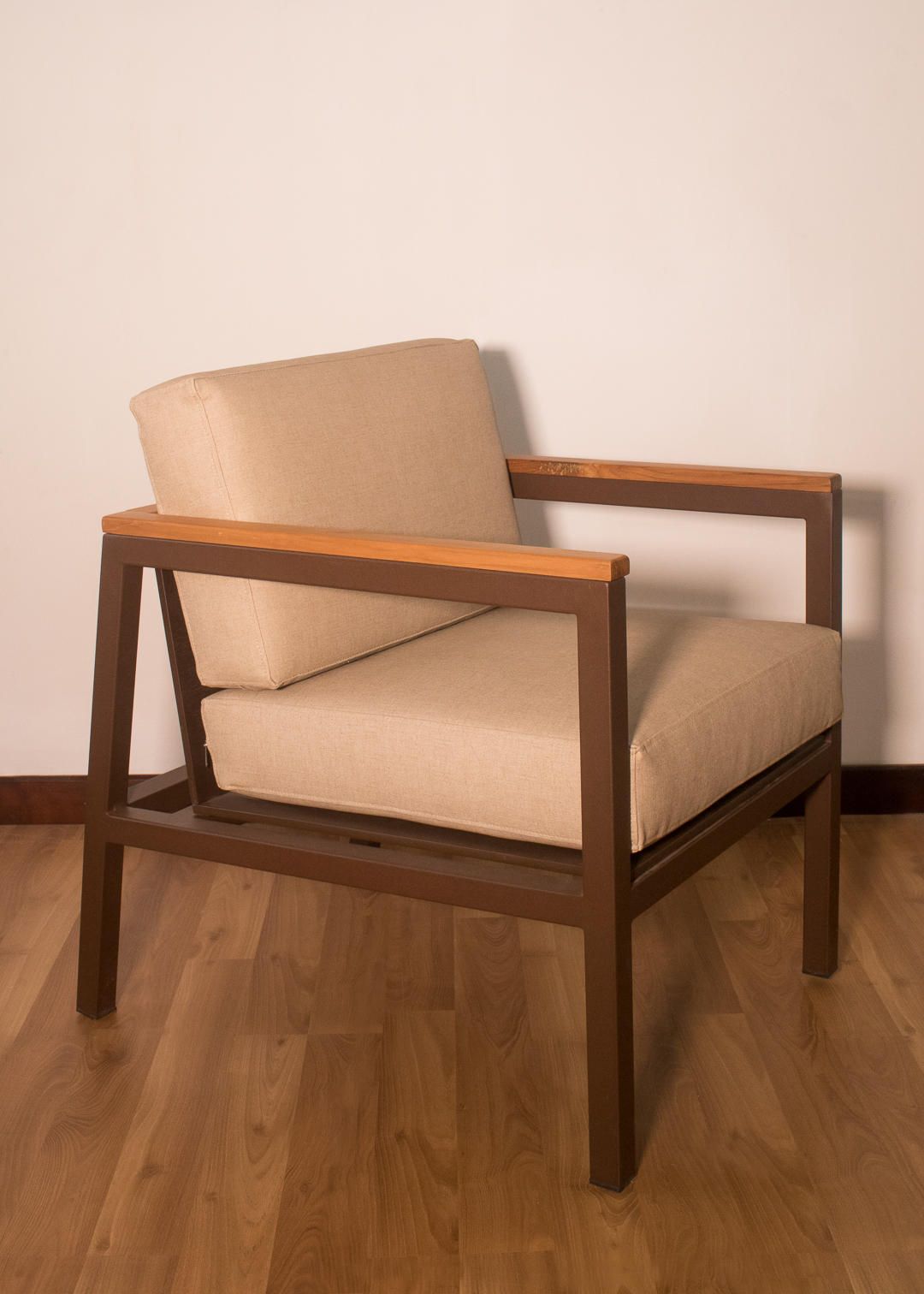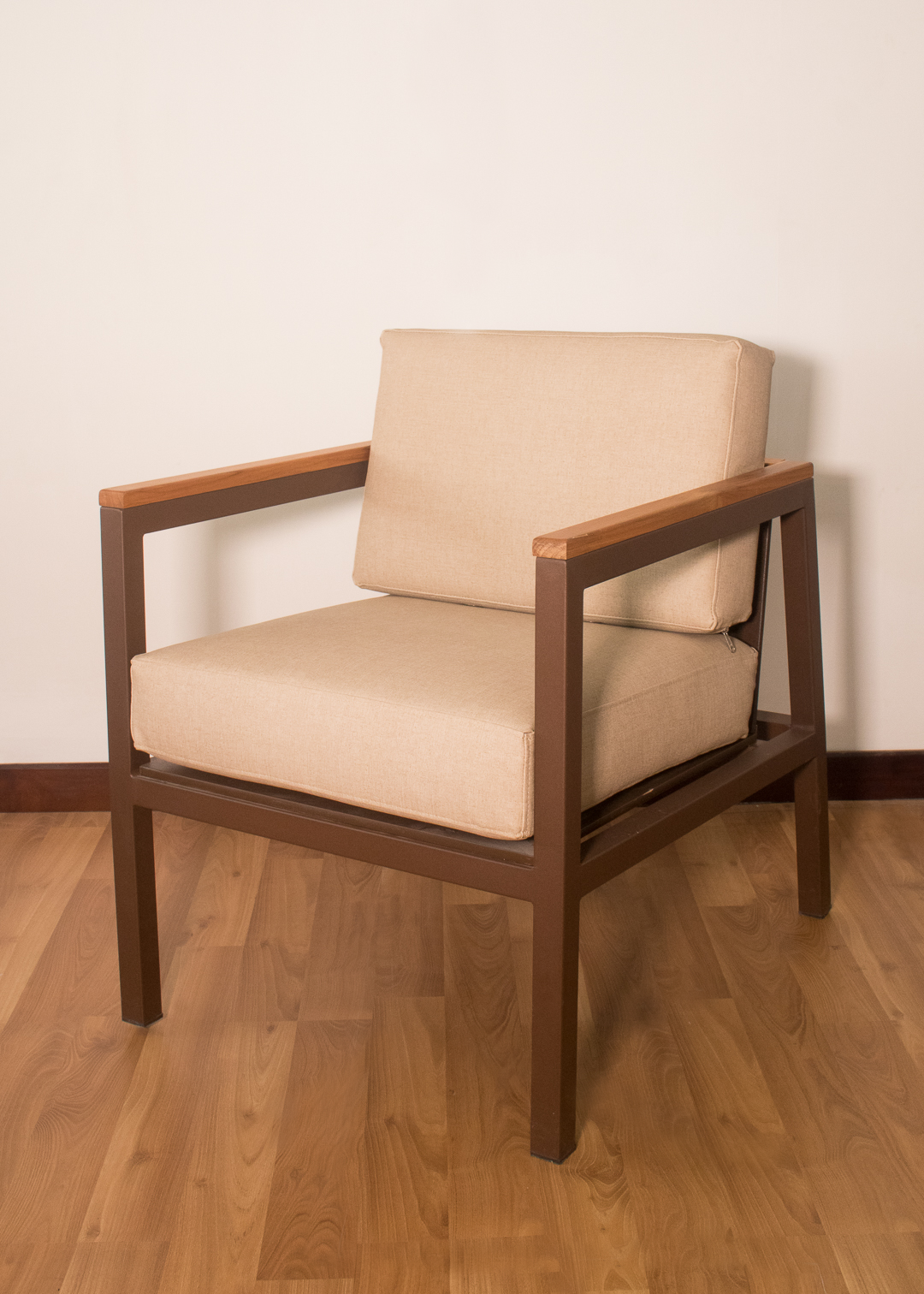 Poltrona para exterior en estructura metálica con pintura electrostática color café oscuro, brazo en teca, cojines para asiento y espaldar en tela náutica suntech para exterior.