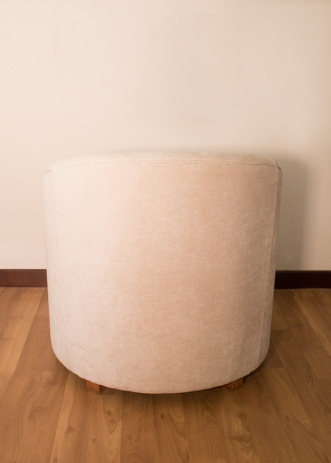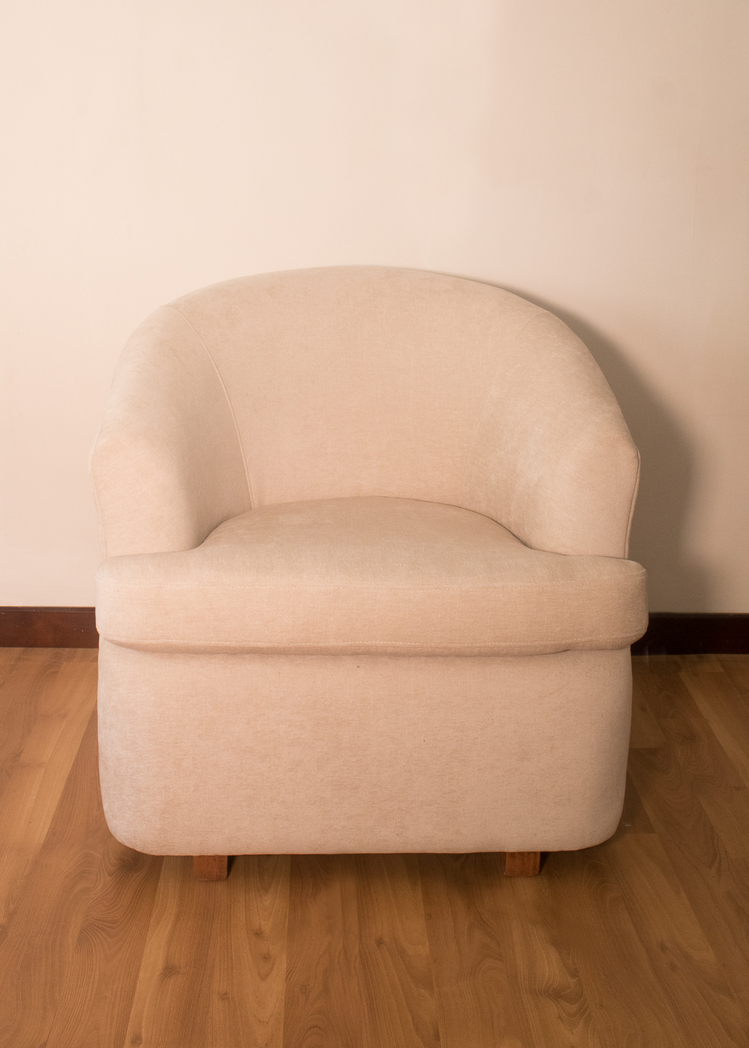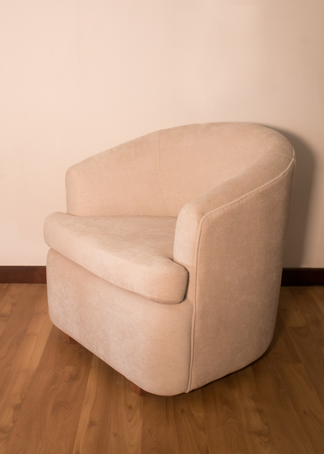 Poltrona para interior con patas en madera roble natural, y tapizado en tela antifluidos y amigable a las mascotas ref: caprimax #02 sand.