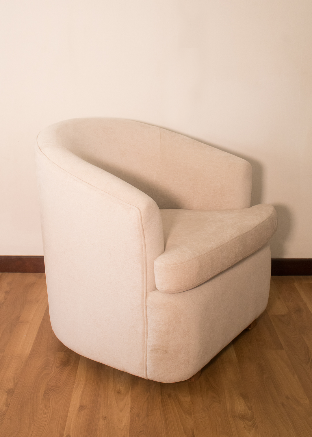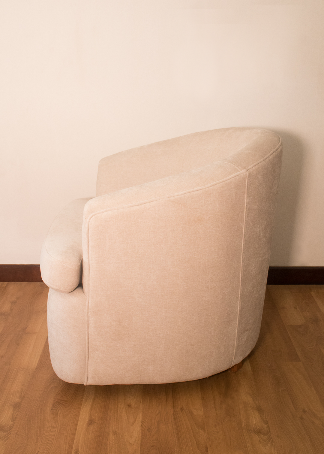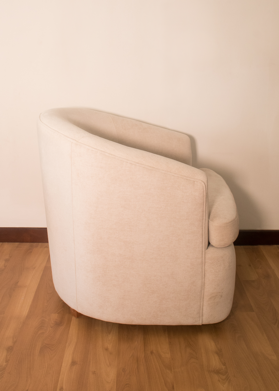 Poltrona para interior con patas en madera roble natural, y tapizado en tela antifluidos y amigable a las mascotas ref: caprimax #02 sand.