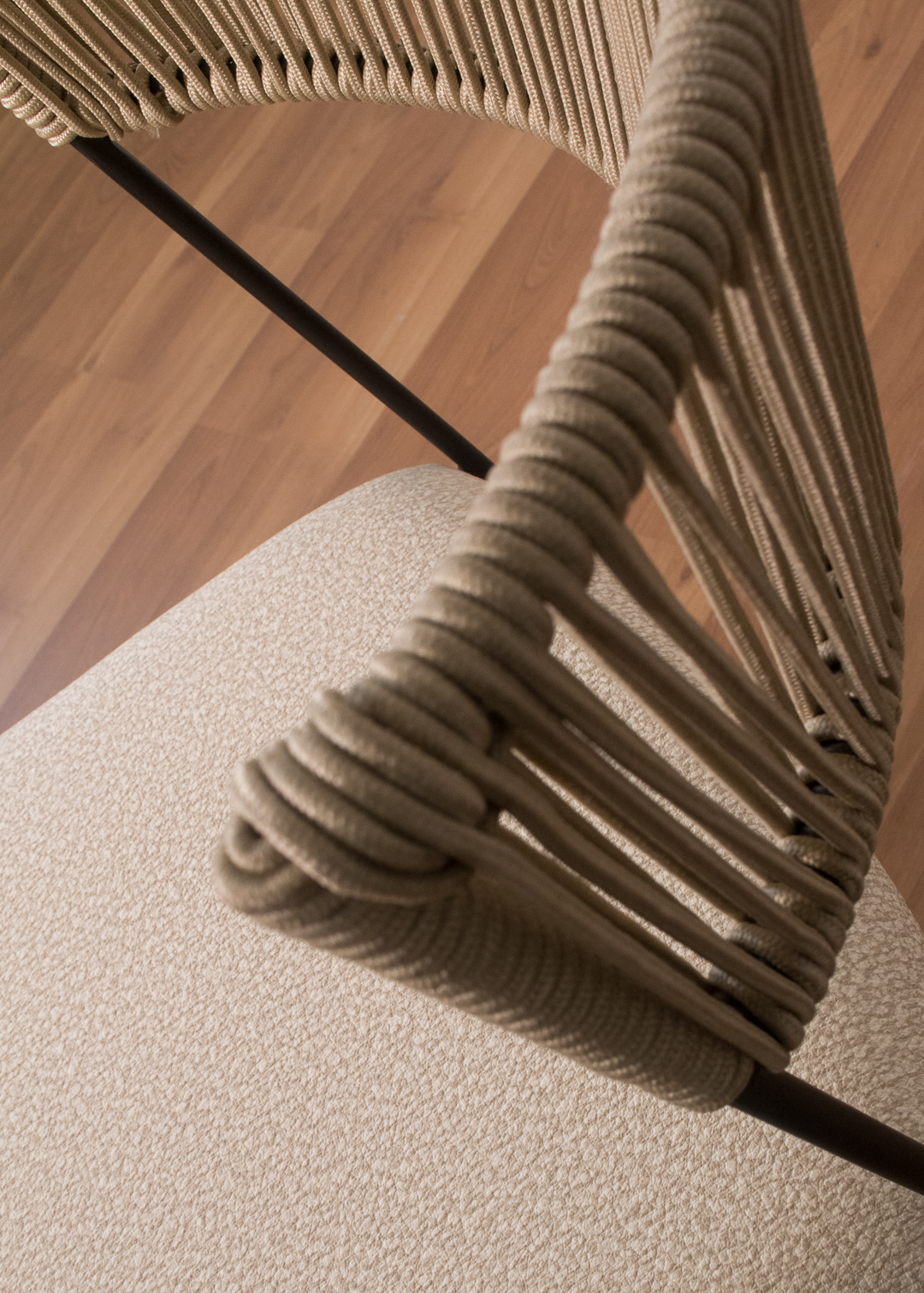 Silla para exterior en estructura metálica con pintura electrostática negra , espaldar tejido en hilo de nylon beige y asiento tapizado en tela antifluidos ref Boucle 4865 Arena.