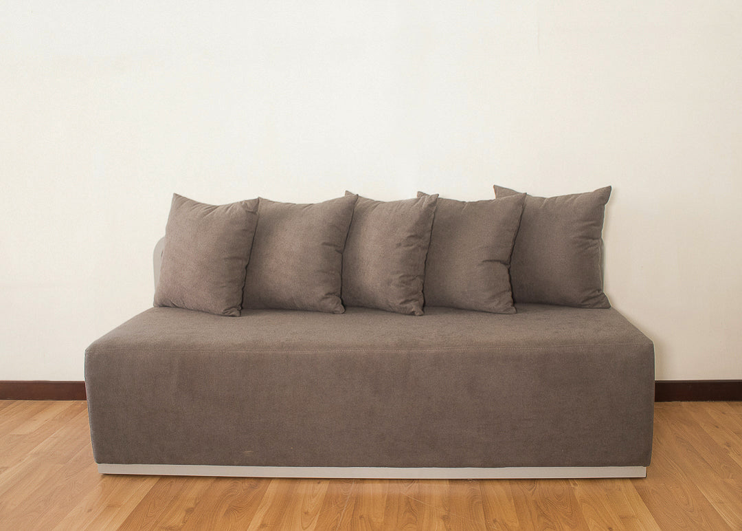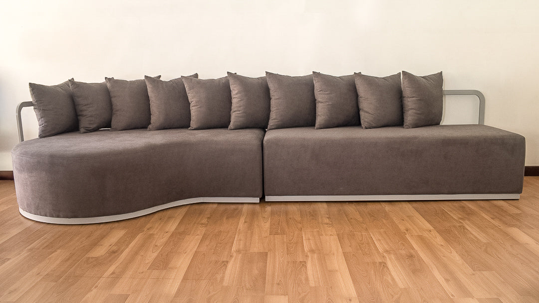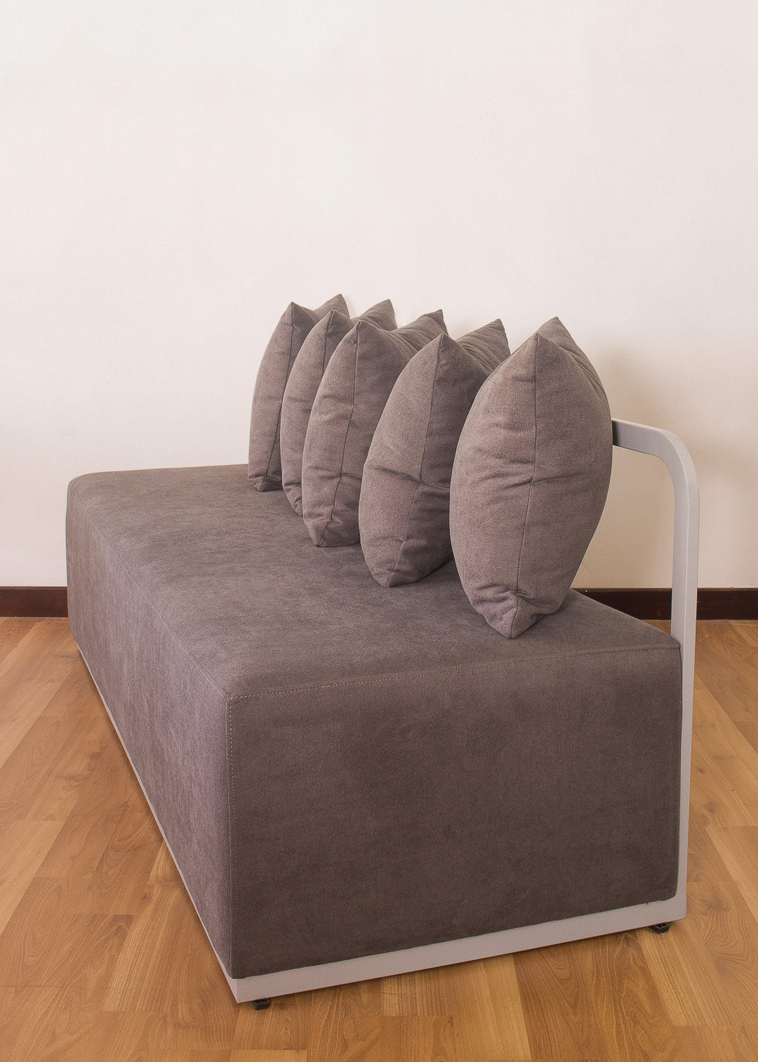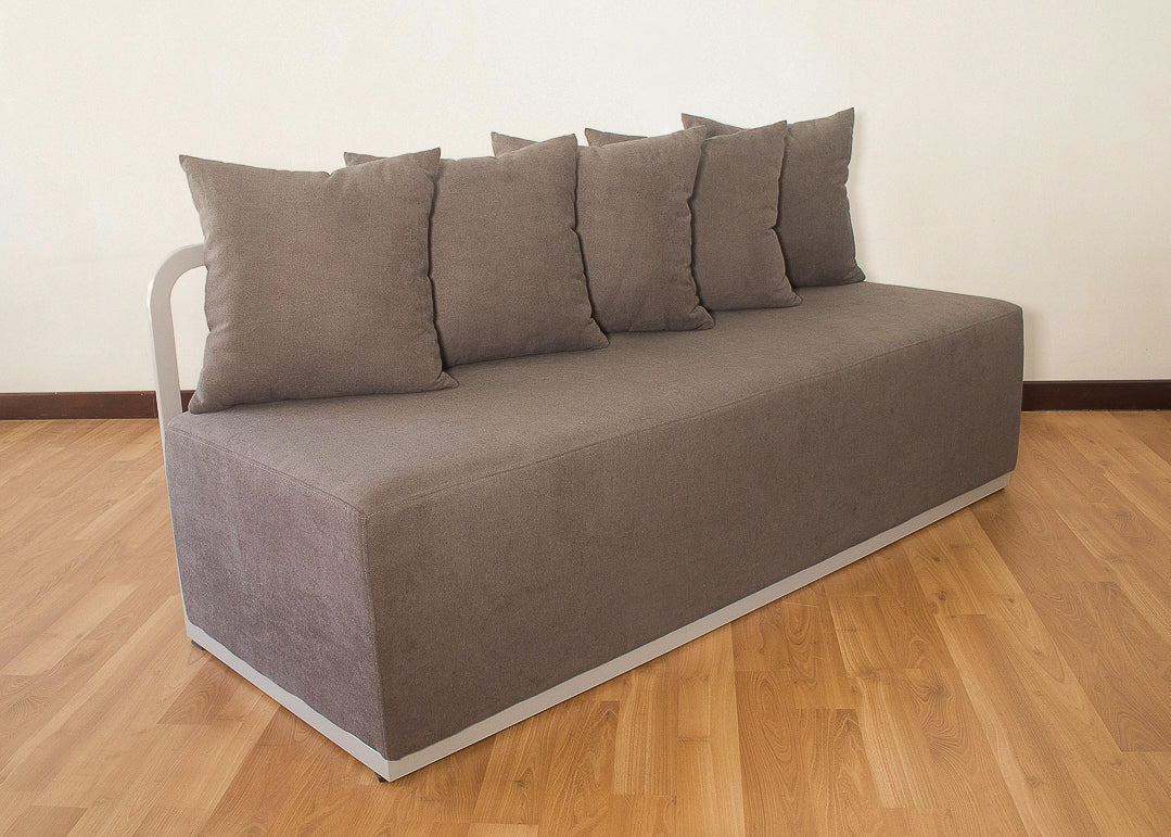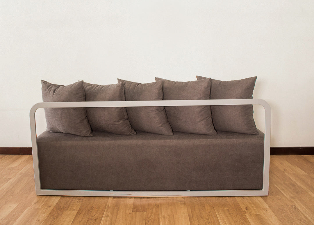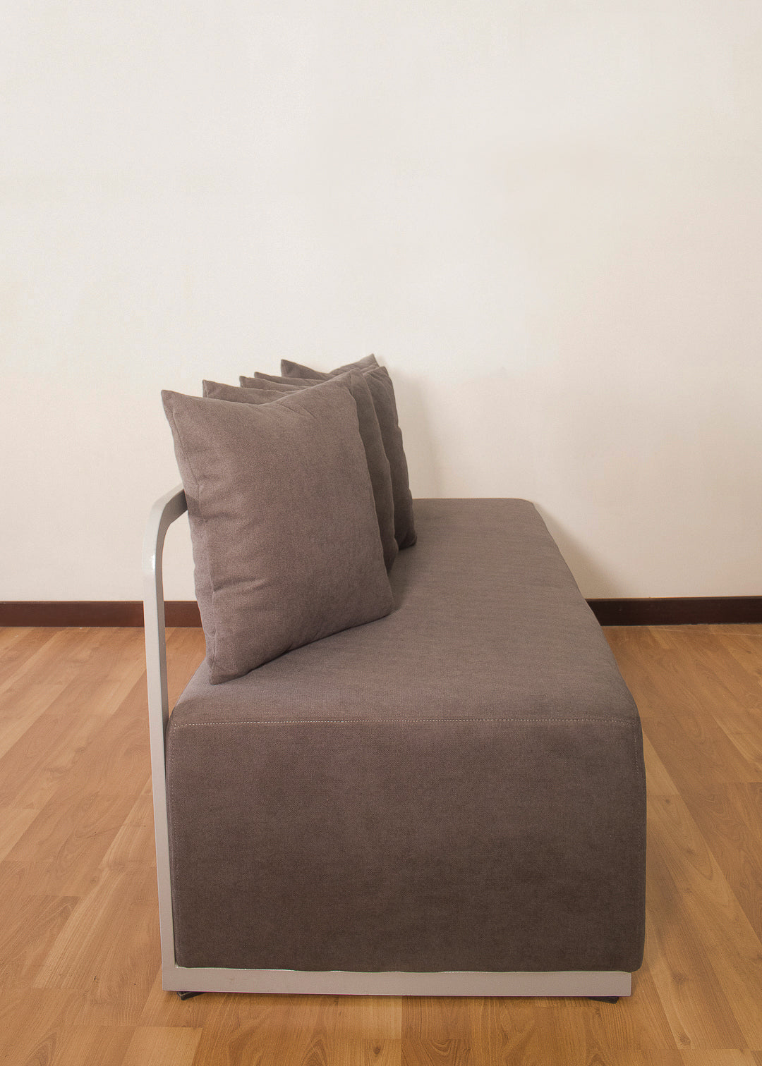 Sofá para interior con estructura metálica, asiento tapizado en tela y acolchado, y cojines en el espaldar.