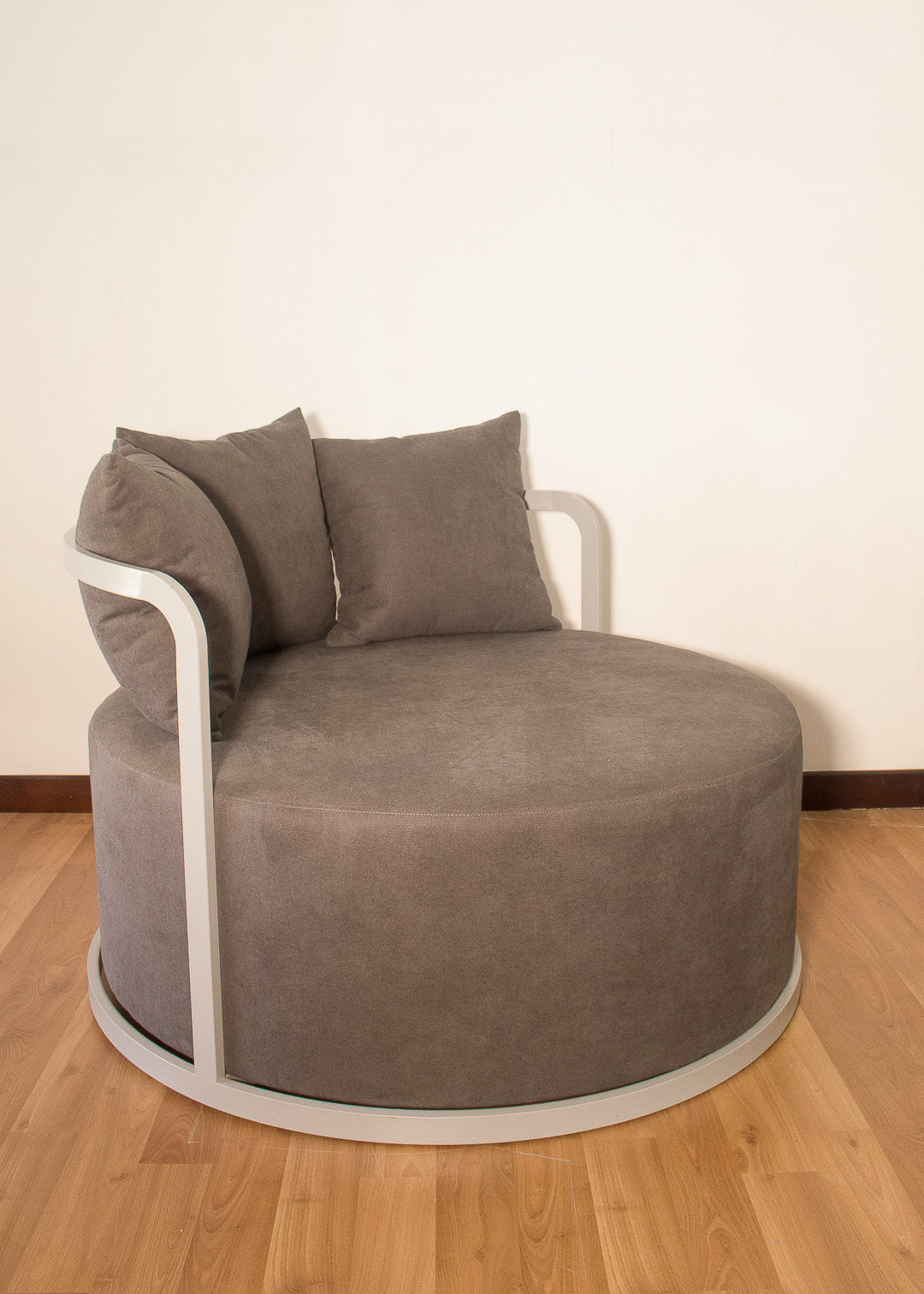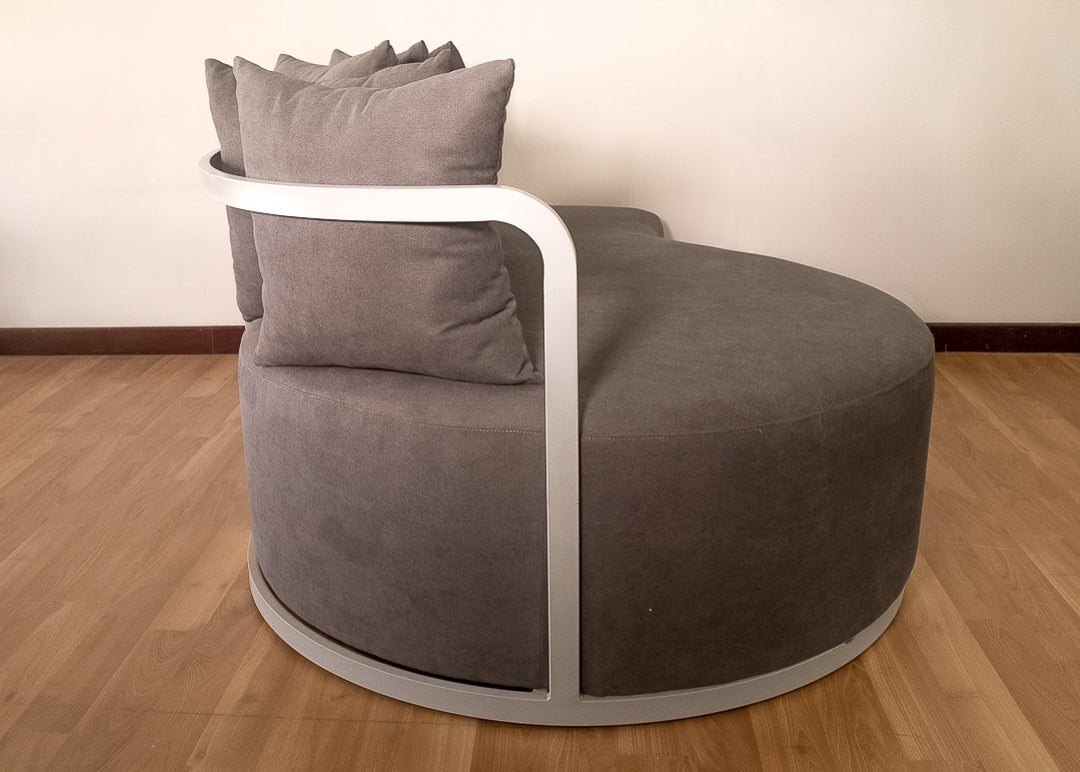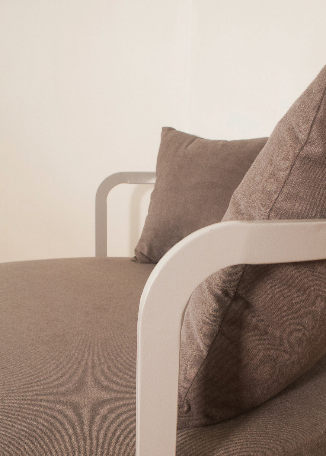 Sofá para interior con estructura metálica, asiento tapizado en tela y acolchado, y cojines en el espaldar.