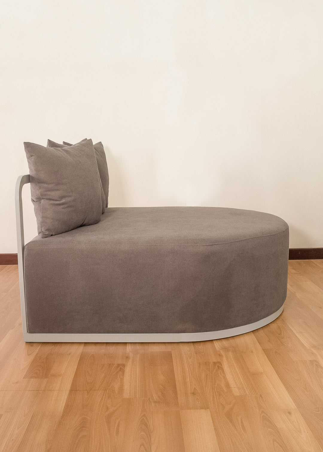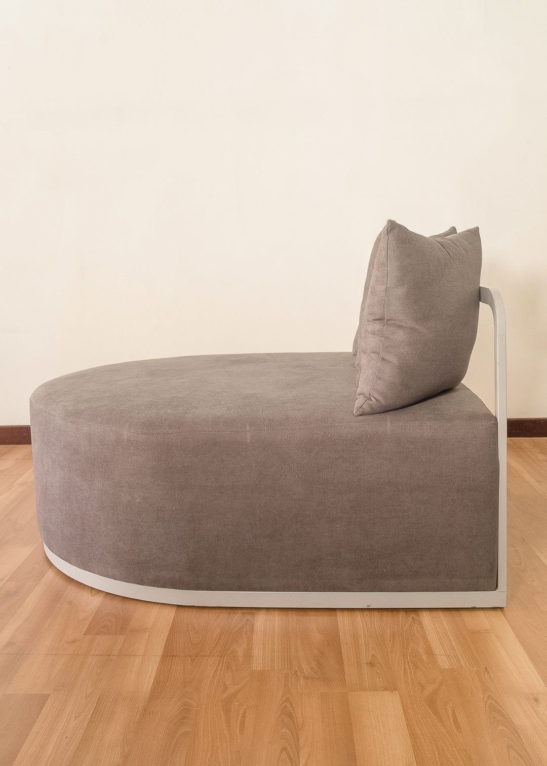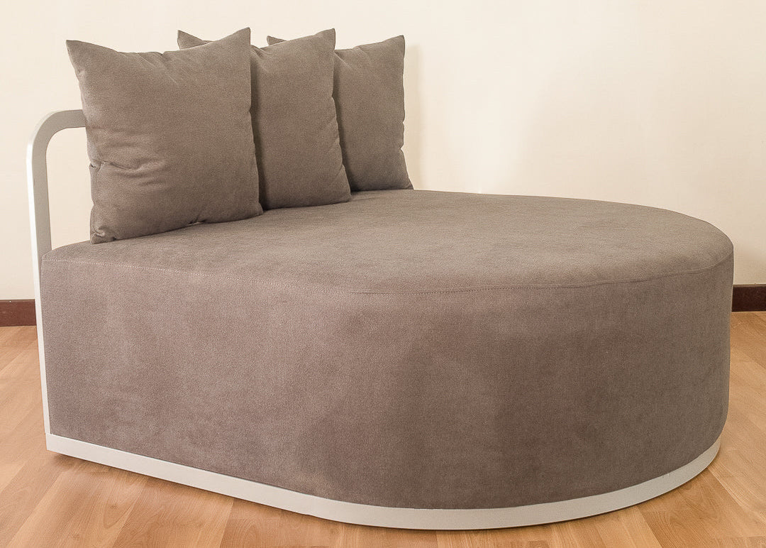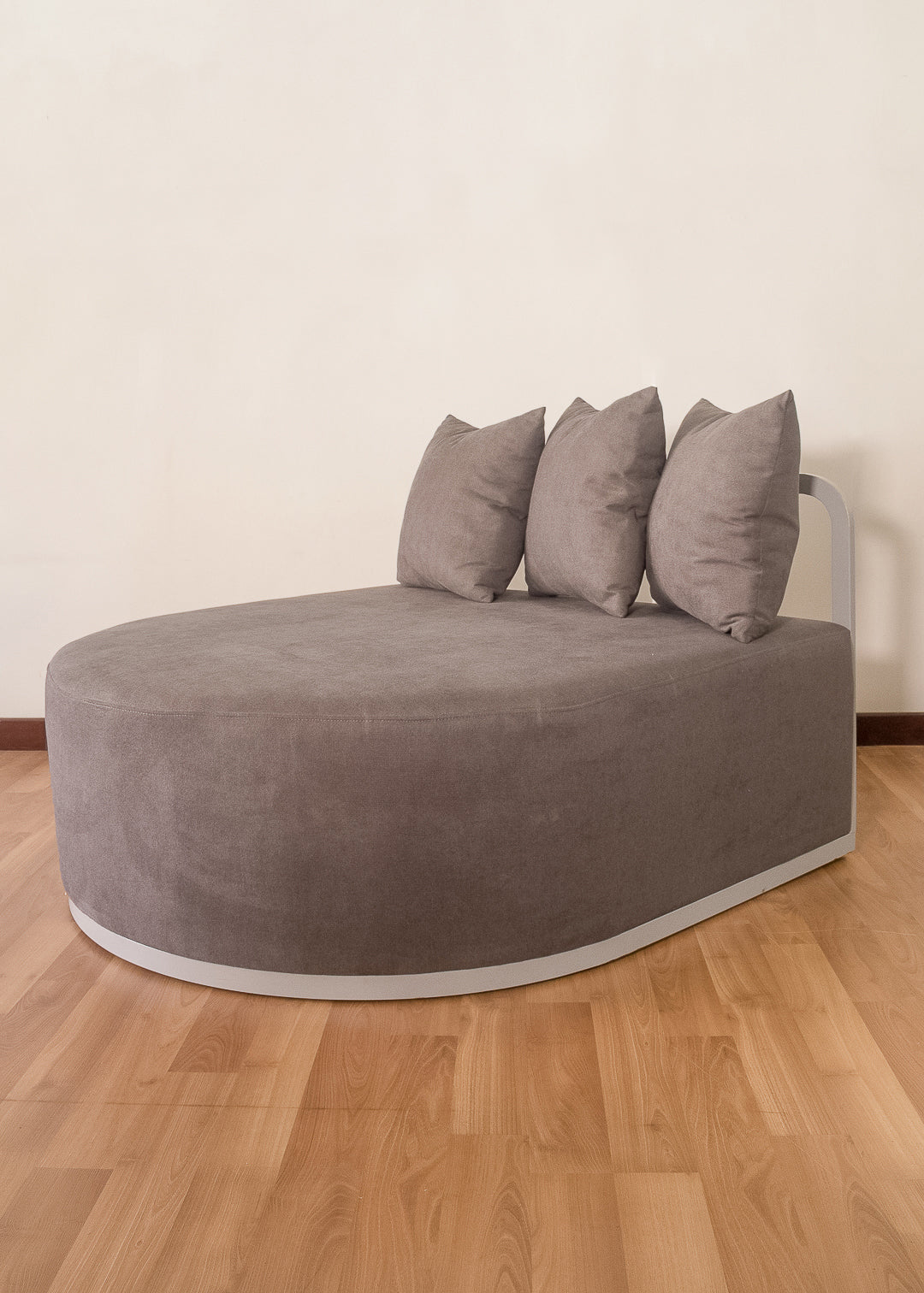 Sofá para interior con estructura metálica, asiento tapizado en tela y acolchado, y cojines en el espaldar.